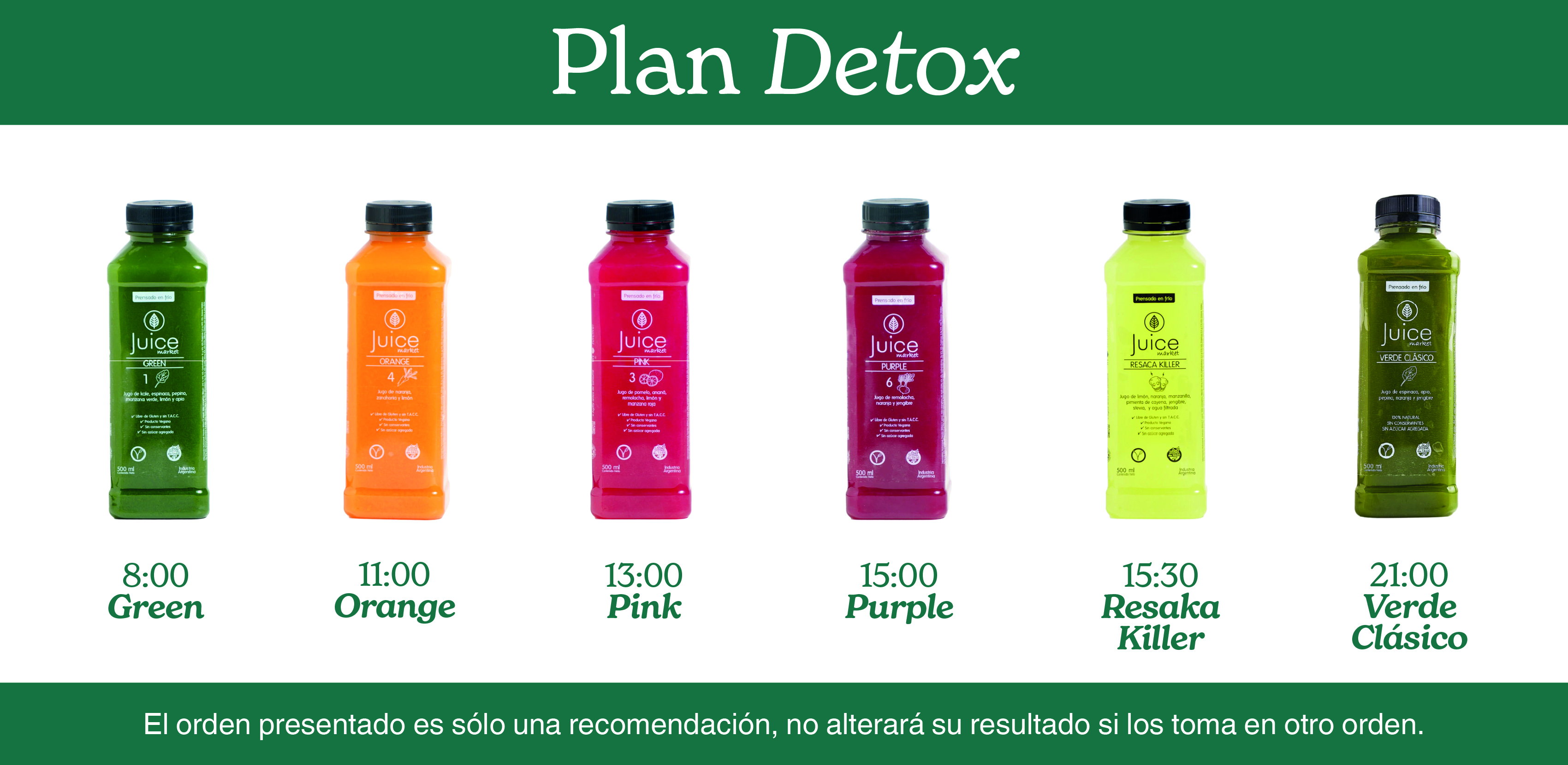 La idea es tomar un jugo cada 2 o 3 horas (no se apure en tomarlo porque puede vomitarlo). El orden de la toma de jugos es sólo una sugerencia, no se alterá el proceso detox si cambias el horario de toma de un jugo por otro.